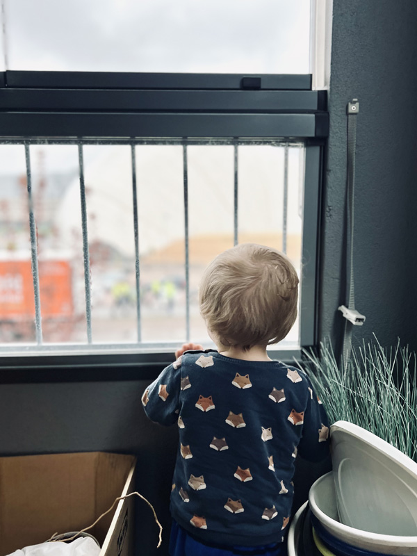 Sään lämmettyä lapset ovat ottaneet parvekkeen lisäleikkihuoneekseen. Ukko käy päivittäin ihailemassa parvekkeella autoja ja rakennustyömaan työkoneita.